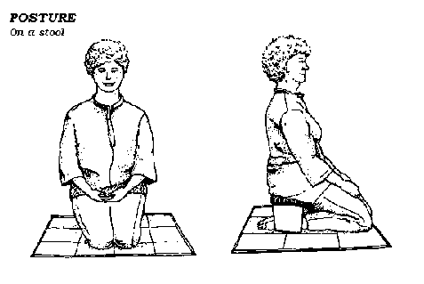 Use a posture that will keep your back straight without strain. A simple upright chair may be helpful, or you may be able to use one of the lotus postures (See the " Notes on Posture"). These look awkward at first, but in time they can provide a unique balance of gentle firmness that gladdens the mind without tiring the body.
